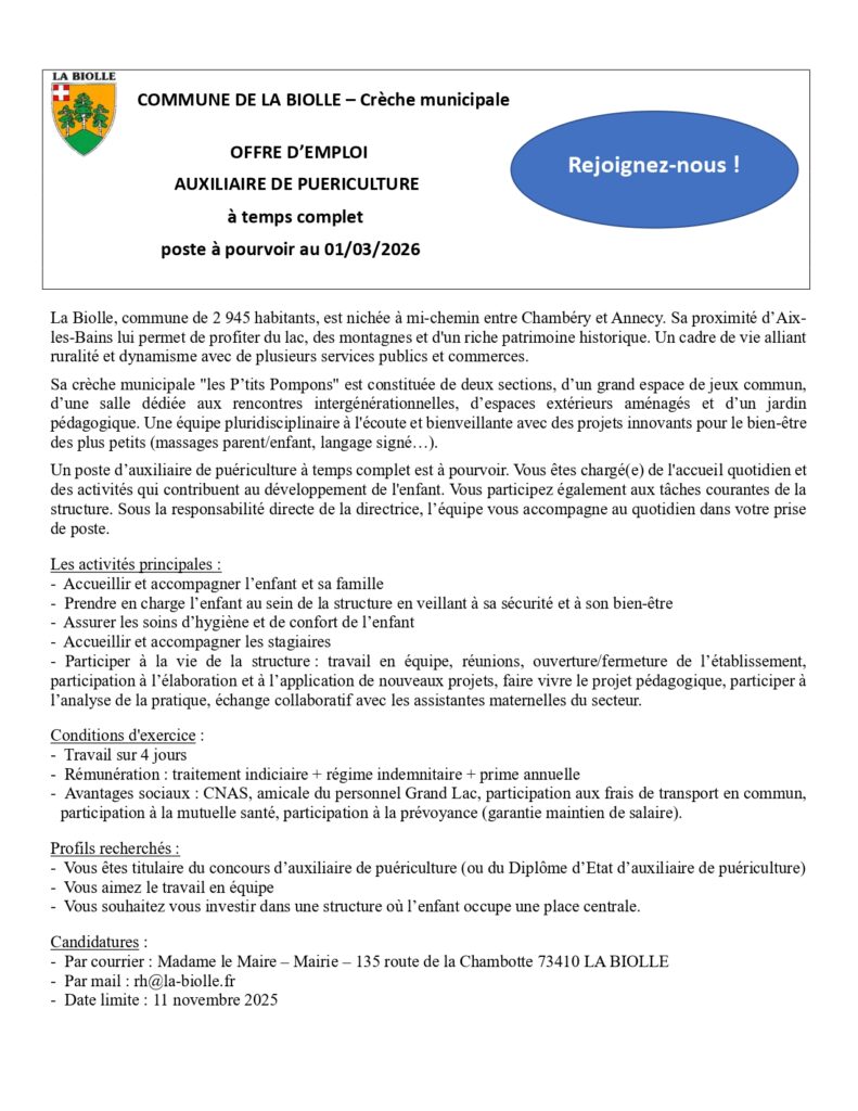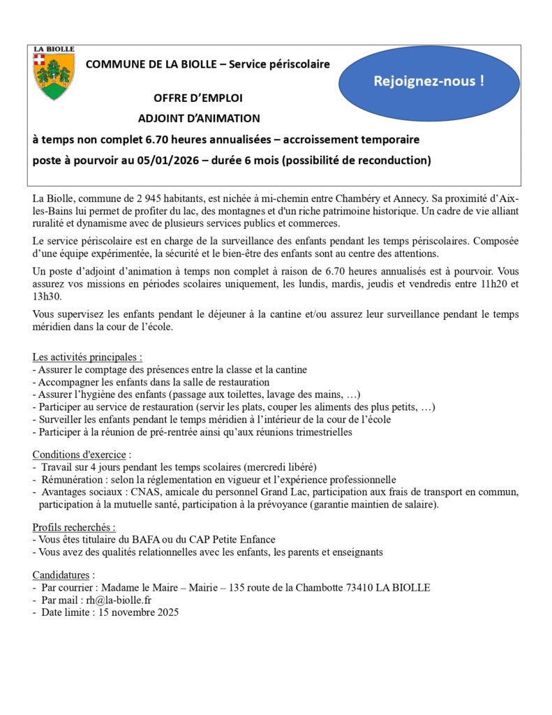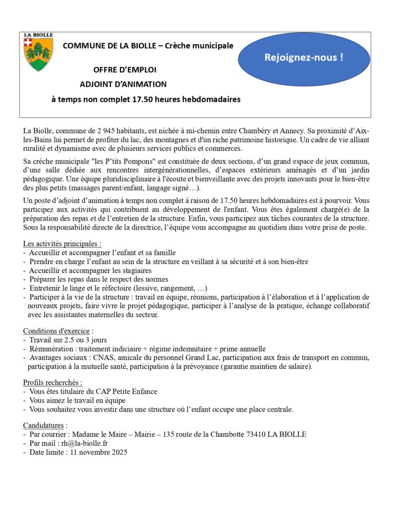 Offres emploi Service Périscolaire et Crèche par Angélique Rolland | Oct 14, 2025 | Offres emploi La Commune recrute ! Venez découvrir les différentes offres : offre emploi Adj Anim TNC 6.70hTélécharger offre emploi Adj anim TNC 17.50hTélécharger offre emploi Aux puér TNC 35hTélécharger